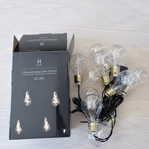 Valot on tarkoitettu sisä- ja ulkokäyttöön. Ulkokäytössä on huomioitava, että muuntaja on asennettava kuivaan sisätilaan. Mukana pari varalamppua.