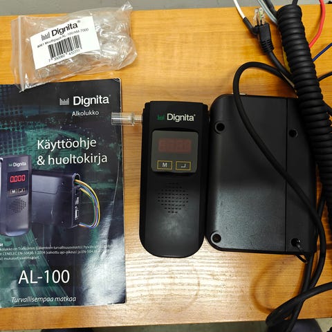 Dignita AL-100 Alkolukko, joka on osoittanut toimivuutensa.Kalibrointi on voimassa 30. toukokuuta 2026 asti.