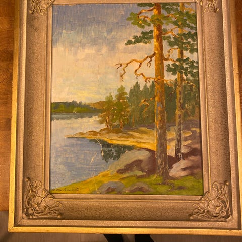 R. Vuolas 1967 maisemaöljymaalaus. 96×47cm kehyksien kanssa 57×106cm .Maalaus on kehystetty ja signeerattu taiteilijan toimesta. Kehykset ovat kärsineet hiukan. Teos on valmistettu öljyväreillä kangaspohjalle.