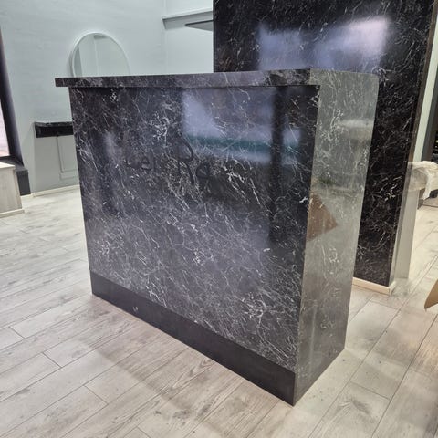 Erinomainen, reilunkokoinen ja tukeva kassapöytä / kassatiski / palvelutiski. Edessä urapaneelit reunoissa ja molemmilla puolilla kassapöytää valkoiset paneelit joiden taakse piuhat saa piiloon. Valmiina aukot johdoille, henkilökunnan puolella pistorasioita ja hyvin säilytystilaa sekä kaapeissa että avohyllyillä. Etupuolelle saa halutessaan kivasti oman logon. Kiinteään kassakaappiin EI ole avainta. Kassatiski on painava, joten omat vahvat kantajat, pumppukärryt, lavat yms mukaan. Vain nouto Espoon Otaniemestä.