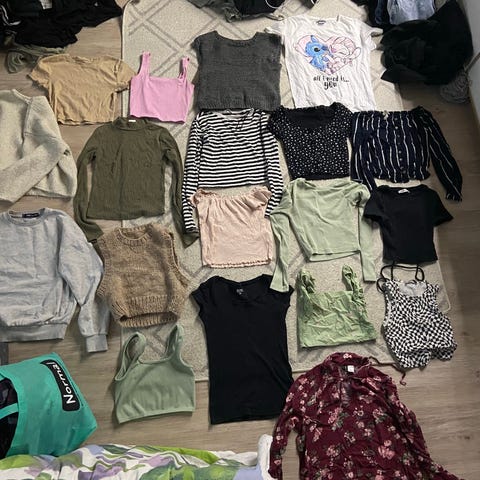 Nuoren nättejä toppeja ja paitoja sekä yhdet farkkushortsit. Kaikki vähän pidettyjä ja hyväkuntoisia, osa lähes käyttämättömiä. Koko xs.