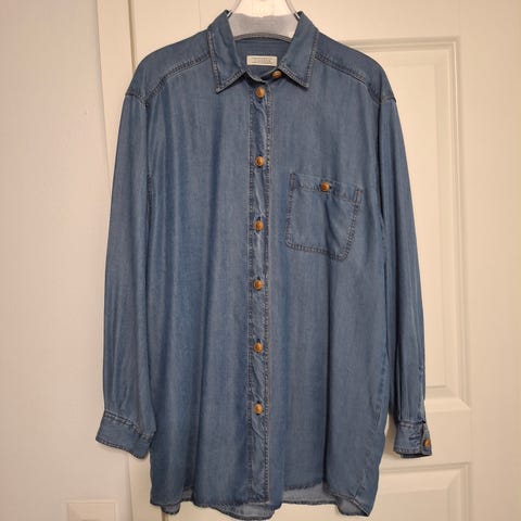Tässä helmiäis -painonappinen 100% pehmeää puuvillaa kiva kevyehkö farkkupaita koko 36-40 riippuen omista mitoistasi. Lähes suora malli ja suora alahelma.