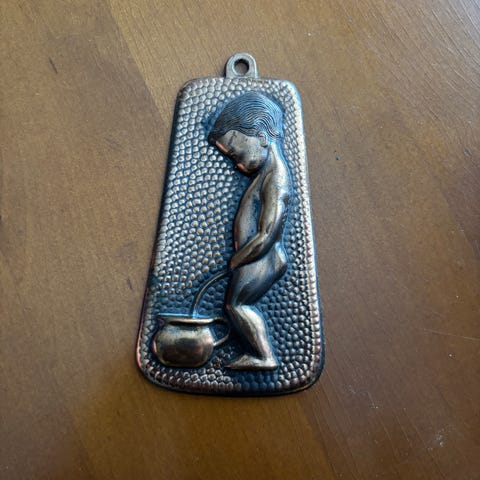 Koristeellinen seinälaatta, jossa on metsäaiheinen maalaus villisiasta. Takana ripustuskoukku