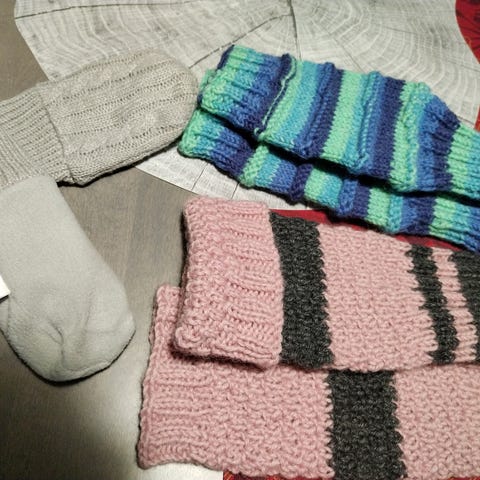 Moniväriset säärystimet, joissa molemmissa yksi rusetti. Leveys 9cm ja pituus 19cm.