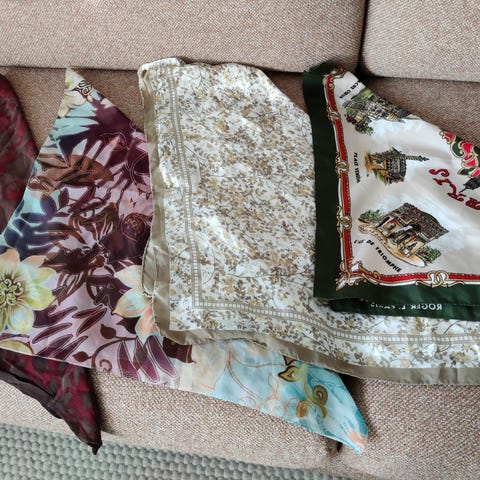 Isot huivit 5kpl yht. 12€. Neljä noista on tuubihuiveja ja yksi ns. rantahuivi esim. uikkareiden päälle ( oikean puoleinen ja ei koskaan käytetty).