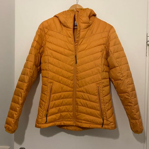 Columbia hupullinen kevyttoppatakki kauniissa syvän keltaisessa sävyssä. Koko L, mutta istuvuuden puolesta sopii hyvin myös M-kokoiselle (38–40).