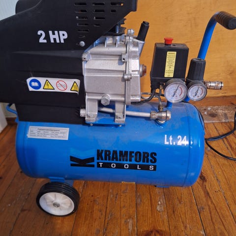 Paineilmakompressori, naulaimet, pulttikone, letkut, sekä rengaspainemittari