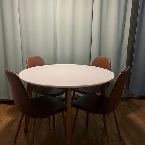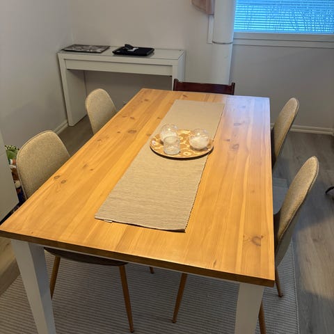 Erittäin hyväkuntoinen ruokailu ryhmä, ei naarmuja tai kolhuja. Tuoleissa valkoinen tekonahka päällys (puhtaat ja ehjät). Vain nouto ja tasaraha käteinen mukaan.Reilut kaupat, ostaja toteaa kunnon ennen kauppoja. Vain nouto. Kauppojen synnyttyä mahdollisuus kotiinkuljetukseen pientä korvausta vastaan lähialueelle.