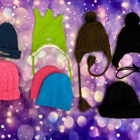 Pinkki/musta neulottu villapipo heijastinlangasta.