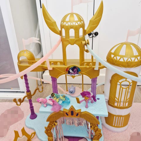 My Little Pony linna. Linnaan tulee valo ja linnassa on vedellä täytettävä seinä. Veden saa kuplimaan, kun painaa helmestä. Mukana tulee toisessa kuvassa ole poni ja tarvikkeet.