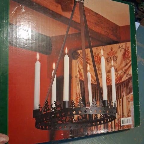 Rillukkapajan valmistama metallinen kynttiläkruunu. Korkeus n. 43cm, ketjun pituus 67cm. Halkaisija n. 35 cm. Siisti, ei ruostetta tai muita tahroja. Väri: antiikkivihreä. Kynttilänpidikkeisiin mahtuu kruunukynttilät tms. Mieluiten nouto. On painava postipakettina.