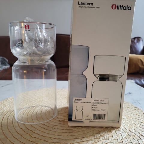 Koristeena ollut Iittala Lantern kynttilälyhty, halkaisija 190 mm, väri ruskea. Valmistettu lasista ja metallista. Sopii sisäkäyttöön kynttilälyhtynä. Mieluummin nouto.Voin postiinkin.