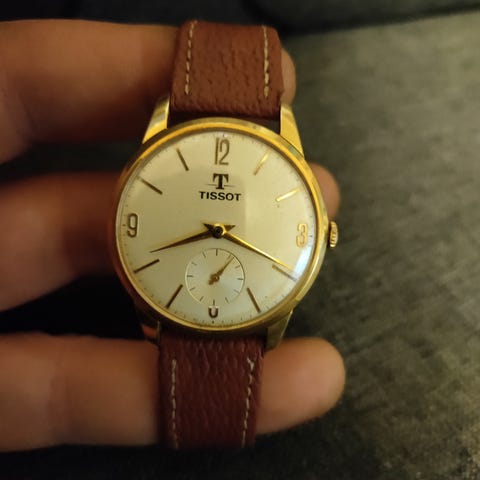 Upea rannekello 1950-luvulta käsinvedettävällä koneistolla. Ei kaiverruksia ja taulu on erinomaisessa kunnossa ikäisekseen. Kello on tunnokas vetää ja käyntikuntoinen, mutta huoltohistoria ei ole tiedossa. Kellon halkaisija ilman nuppia mitattuna on 35 mm. Siihen on juuri asennettu uusi musta nahkaranneke ja sen mukana tulee alkuperäinen Tissotin säilytysrasia. Swiss made. Toimitus tarvittaessa myös toridiilillä.