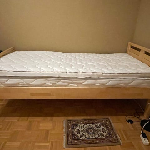Patjan koko, joka sopii 90x200cm. Sänkyrunko mäntyä, pohja vaneria. Hyvä, käyttökelpoinen sänky.