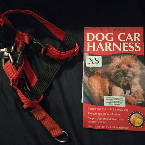 Koiran autovaljaat ja matkavesipullo/juomakuppi. Esim. ranskanbulldoggin kokoiselle koiralle.