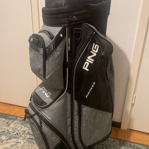 PING valkoinen koko nahkainen laadukas kärrybägi. Paljon säilytystilaa. Vetoketjut toimii hienosti ja bägissä ei ole mitään repeytymiä. Nahka on vain hieman lähtenyt kuoriutumaan osasta paikoista. Uutena maksanut noin 600 euroa.