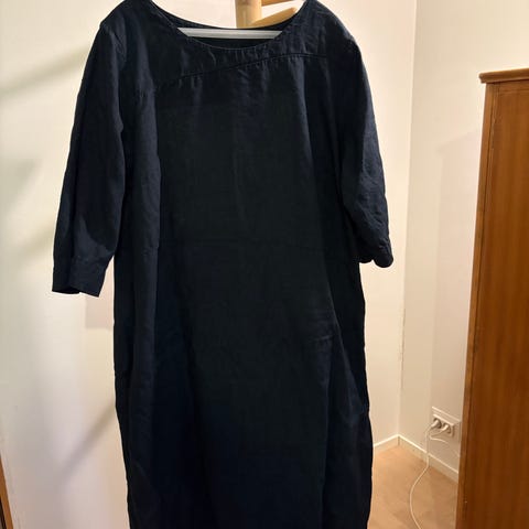 150 cm oleva täysmusta pitkä mekko. Koko M. Pellavaa. Kaulus ulottuu olkapään yli
