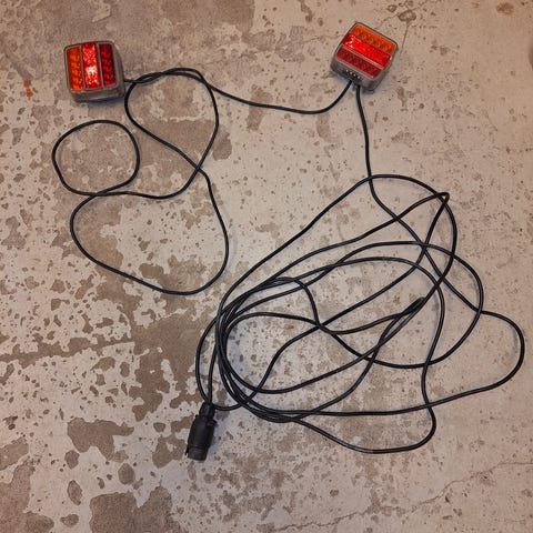 Meillä meni peräkärrystä valaistusjärjestelmä hajalle ja ostin tämän väliaikaiseksi se oli käytössä pari viikkoa ja nyt kun kärrystä on valot kokonaan uusittu niin tämä jää turhaksi. On siis uudenveroinen ja pakkauskin vielä löytyy mukaan. Takavalot ja monta metriä johtoa toisessa päässä töpseli, valot kiinnitetään magneetilla kärryn takareunaan ja itse laitoin johdon nippusiteillä kiinni kärryn runkoon. Aika helppo saada lainmukaiset valot toimimaan. Nouto tai toriDiilillä postitus