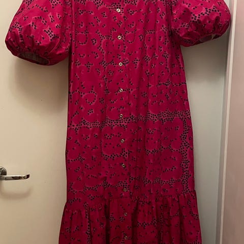 Mekon on suunnitellut Annika Rimala vuonna 1963. Tämä mekko on vuodelta 1975. Mekko on 100 % puuvillaa, siinä on puffi hihat, vyötärölle solmittava vyö, helmassa leveä rypytysosa, jossa vahvikekangas. Hihoista vahvikekangas on otettu pois.