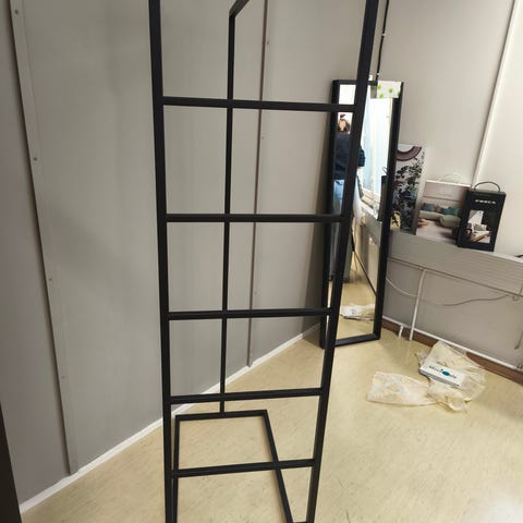 Valkoinen itsetehty vintage hyllykkö. Yleisilme siisti. Ollut meillä kirjahyllynä ja leluhyllynä. On tukeva ja seisoo itsekseen. Kiinnikkeet takana yläosassa, jos haluaa kiinnittää seinään ettei kaatuisi. Meillä seissyt iteksiään.