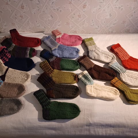 Rakastan neulomista, mutta ihminen tarvitsee vain tietyn määrän villasukkia elämänsä aikana. Myynnissä huolella käsinneulotut, kuvassa olevat ihanan värikkäät villasukat kestävästä sukkalangasta koossa 38. Sujauta omiin jalkoihin tai pehmeään pakettiin!