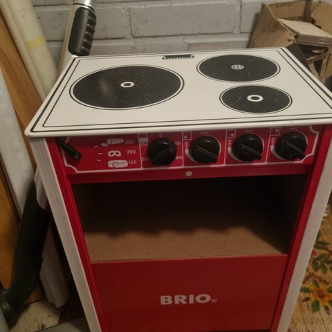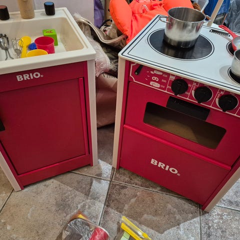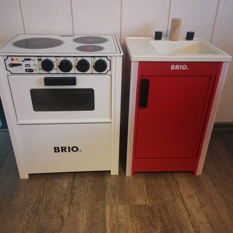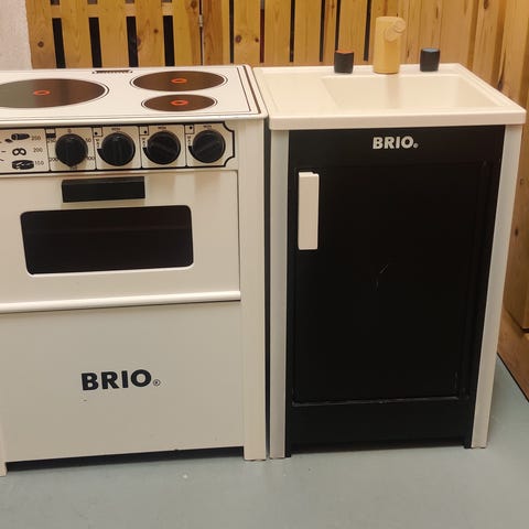 BRIO leikkikeittiön hella ja allaskaappi. Hellan takaseinä on haljennut.