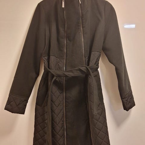 Mamalicious-merkkinen s-koon villakangastakki. Vetoketjullinen "laajennusosa". Vyötäröllä solmimisnauha. Havaittavissa pientä nukkaantumista, mutta silti oikein käyttökelpoinen.
