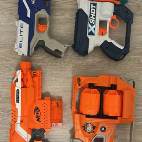 Nerf Retaliator lasten leluase, toisena pikku Nerf Zuru pyssy. Molemmat toimivat.