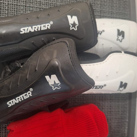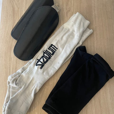 Jalkapallosuojat ja hanskat (koko s). Mukana myös skeittaukseen sopivat suojat
