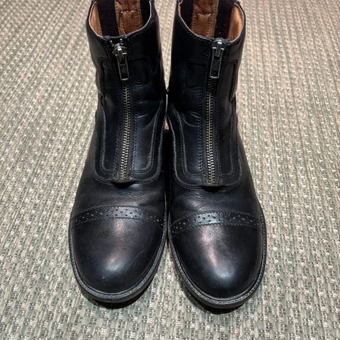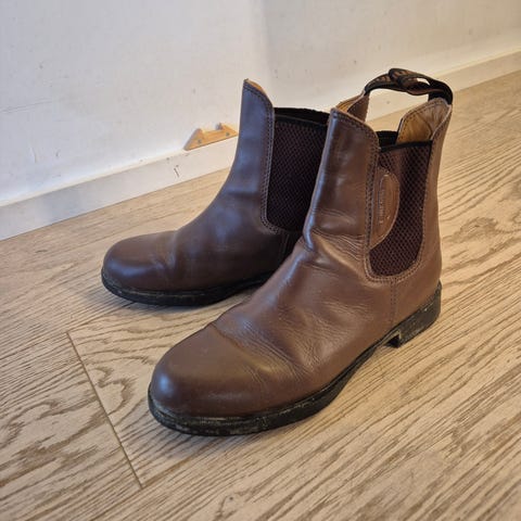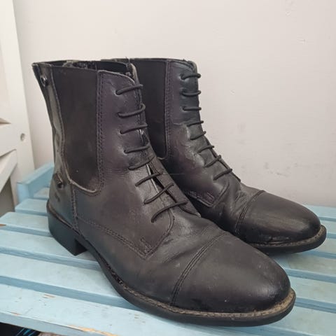 Pieneksi jääneet ratsastuskengät. Kunto muuten oikein hyvä, mutta toisen kengän päällä reikä joka tullut, kun poni astui jalalle. Reikä vain pinnassa, ei läpi.