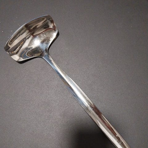 Myynnissä uudenveroinen kolo löylykauha. Kauha alumiinia, varsi bambua.