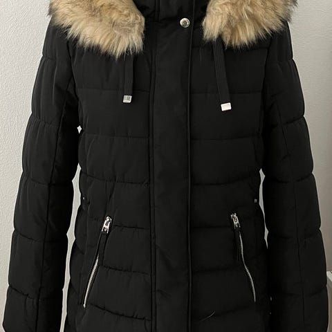 Zara Talvitakki mustassa värissä, naisten koko S. Takissa on vetoketju ja napit edessä. Sisävuori on ruudullinen. Takki on suunniteltu tarjoamaan lämpöä kylmillä säillä.