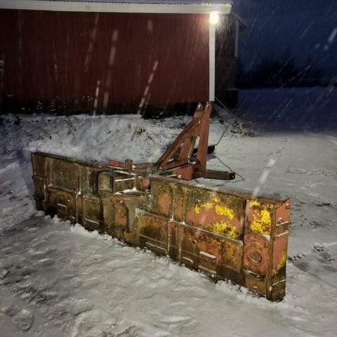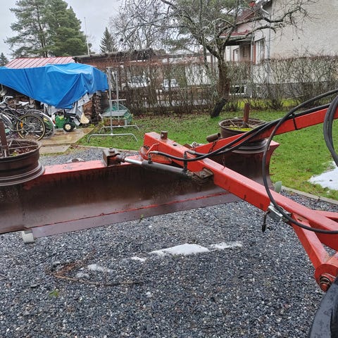 Hydraulinen perälevy. Leveys 2340mm. Takana tukipyörille paikat. Tukisukset alla, auttaa aurauksessa. Lastauksessa avustetaan.