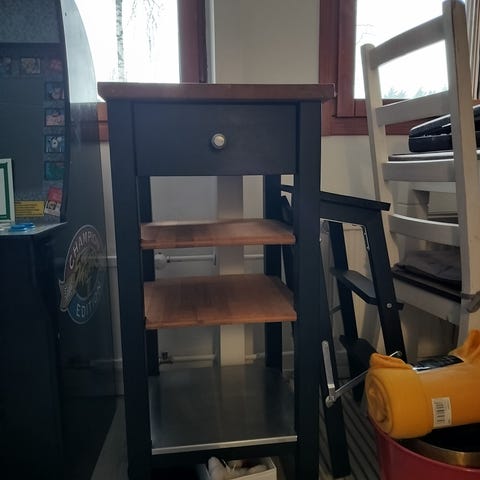 Ikea sivu/apupöytä lasisella maitolasikannella. Leveys 99, syvyys 52, korkeus 72.Harmaat jalat. Hyvä kunto, pinnassa ei mitään isoja naarmuja näy. Haku Espoon lippajärveltä. Jalat pyöritetään paikoilleen, nyt purettuna.