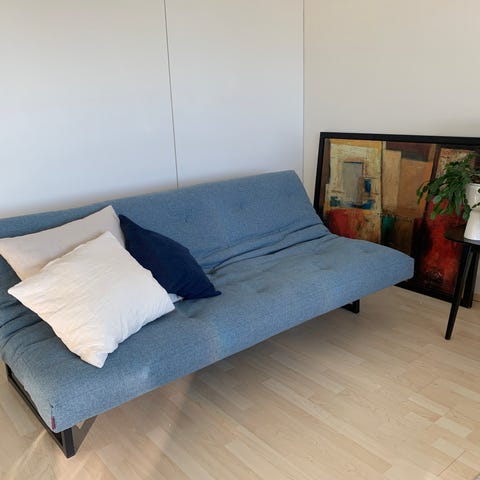 Kangasverhoiltu keltainen vuodesohva kunnollisella sänkymekanismilla. Saa joko yhden hengen tai kahden hengen sängyksi. Omat kantajat mukaan, painava
