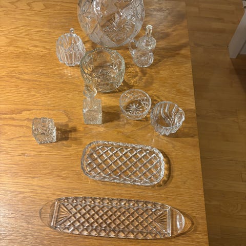Val Saint Lambert kristallilasisetti, joka sisältää 11 kappaletta vihreitä laseja. Laseissa on koristeellinen leikkauskuviointi ja ne on valmistettu kristallista. Sopii käytettäväksi juomalaseina.