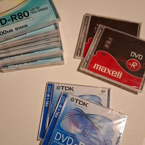 Kaksi uudelleenkirjoitettavaa CD-levyä ja yksi tallentava romppu paketissaan