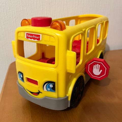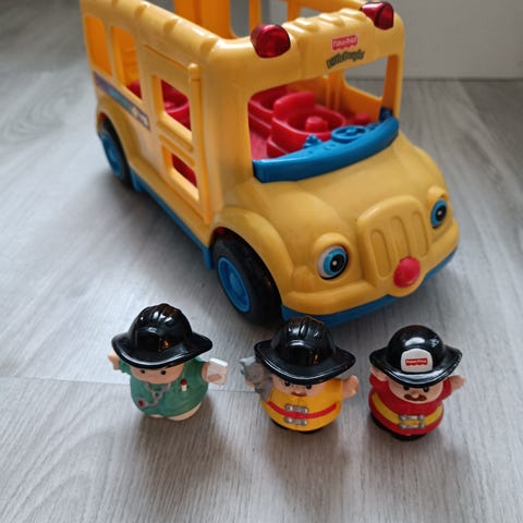 Fisher price merkkinen koulubussi leluauto. Sisältää 3 hahmoa. Kyltit bussissa väritetty lapsen toimesta ja patterikohdan kansi hävinnyt eikä tietoa toimiiko äänet. Kissatalous