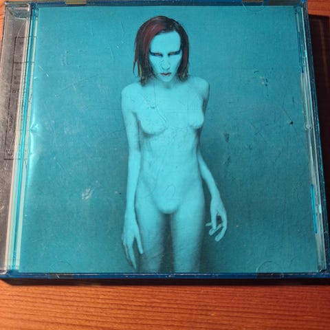 Marilyn Manson Mechanical Animals CD-album. Mukana alkuperäinen kannellinen kotelo ja levyn kansitaide. Albumi sisältää musiikkia ja on julkaistu CD-muodossa.
