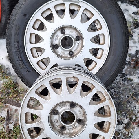 Tyhjätään varastoja. Näitä vanteita on siis 2 kpl. Päällä kelvottomat renkaat.