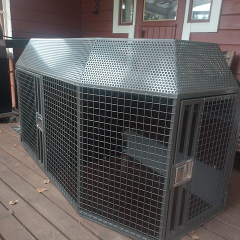 Kahdelle koiralle, väliseinä helposti irrotettavissa. Pohjan mitat 102x98cm korkeus 78cm.