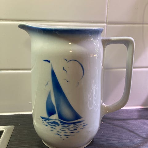 Lohkeama ja pieni halkeama kaatonokassa. Pitää nestettä eikä estä käyttöä. Pohjassa kakkoslaatuun viittaava leima. Tarjoa...