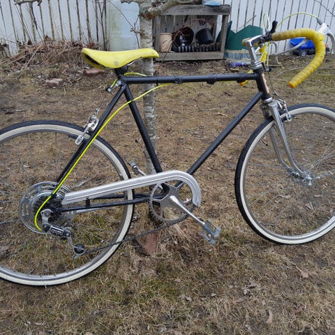 4 vuotiaan ensimmäinen polkupyörä renkaan koko ei tiedossa mutta mahdollisesti pienempi kuin 16tuumaa. Vanha ja hyvin käytetty ja kolhittu mutta toimii edelleen. Renkaat huonossa kunnossa mutta pitävät ilmaa
