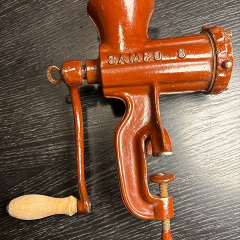 Sampo 8 lihamylly.Ei ole käytetty aikoihin, ollut navetassa jemmassa. Eli myydään ns koristeena. Varmasti voi käyttääkin, jos putsaa ja tarkistaa osat.... 15e/tarjous