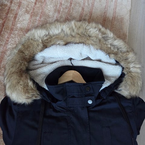 Kevyt takki vetoketjulla ja nyöreillä. Takin saa käärittyä omaan taskuunsa, josta tulee pussukka.
