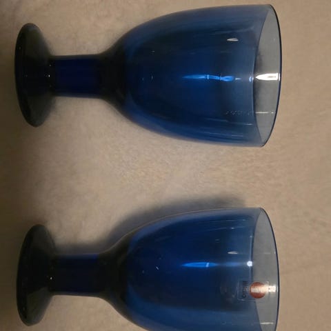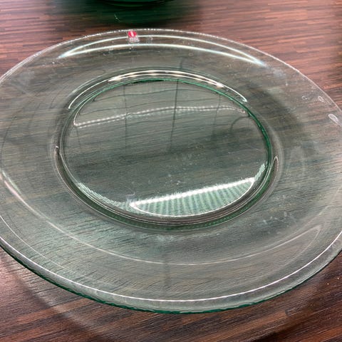 Iittalan tarrat kahdessa lautasessa, muista lähteneet irti pesussa. Toinen naarmuisista lautasista tarrallinen, toinen tarraton.