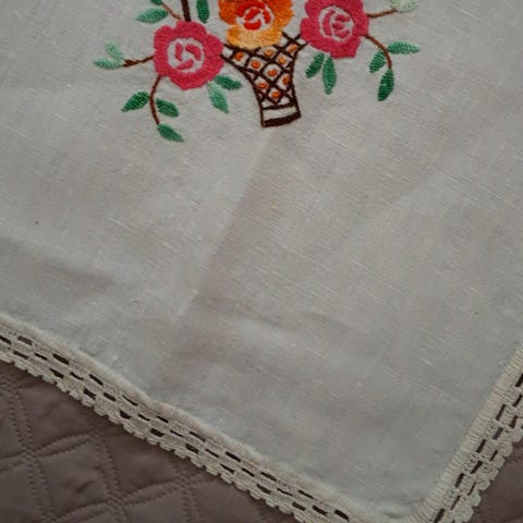 Kirjailtu pöytäliina pitsireunuksella, koko 45 x 48 cm.