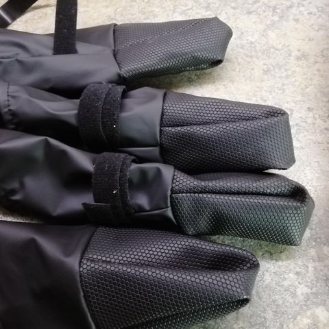 Kaikkiin jalkoihin pitkät saapikkaat. Pysyvät jalassa, liinat kulkevat selässä, ja kaulaan tulee panta. Kerran käytetty, ei tarvetta enää. Olleet uros labukalla.