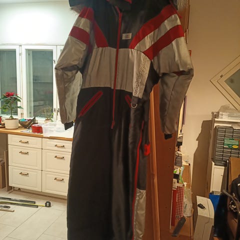 Naisten talviurheiluasu, koko S. (Takki M kokoiselle asti). Asu sisältää sinivalkoisen takin ja mustat housut. Materiaalit soveltuvat ulkoiluun ja talviurheiluun. Takissa hihojen taskuun soveltuu lasketteluhissi kortti. Huppu., Housut merkitty 164cm , ovat S. Henkselit lisänä. Saat tämän kokonaisuuden 20€ Nouda Espoosta!