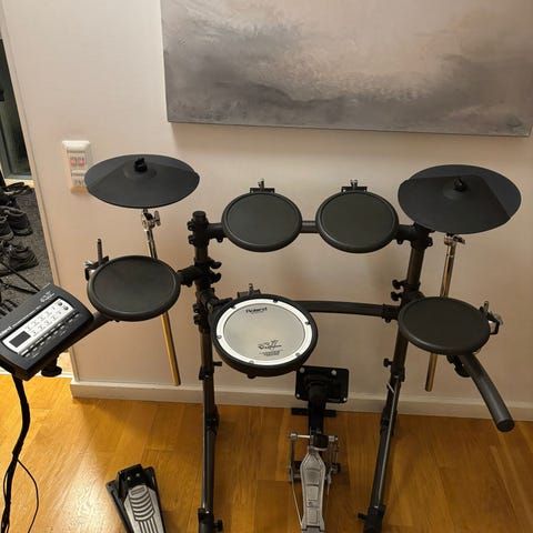 Roland TD-1 Sähkö-rumpusetti, jossa on mustat rumpupadit ja symbaalit. Setti sisältää rumpupadin, virityspaneelin ja pedaalit. Sopii harjoitteluun ja pienimuotoiseen soittoon kotikäytössä. Ollut käyttämättä sisätiloissa pari vuotta. Nyt kokeiltaessa vasen pedaali ei toiminut. Pedaalin sisällä oleva kumi varmaan "väsynyt". Tuollaisella setillä saa kuntoon https://www.aliexpress.com/item/1005009587740006.html?src=google&pdp_npi=4%40dis!EUR!3.28!2.88!!!!!%40!12000049546463784!ppc!!!&src=google&albch=apprmkt&albagn=182499396&albcp=22790724138&albag=&albad=&aff_short_key=_oFgTQeV&isdl=y&aff_platform=true&traffic_server_nav=true&gad_source=1&gad_campaignid=22800290353&gclid=EAIaIQobChMIkoWa9pe2kQMVOgCiAx2h5BTvEAQYAyABEgKdv_D_BwE